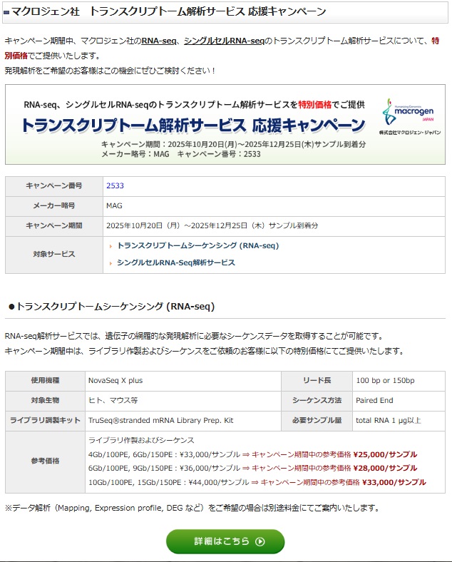 マクロジェン社 トランスクリプトーム解析サービス 応援キャンペーン