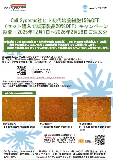Cell Systems社ヒト初代培養細胞15%OFF (セット購入で試薬製品20%OFF)キャンペーン -