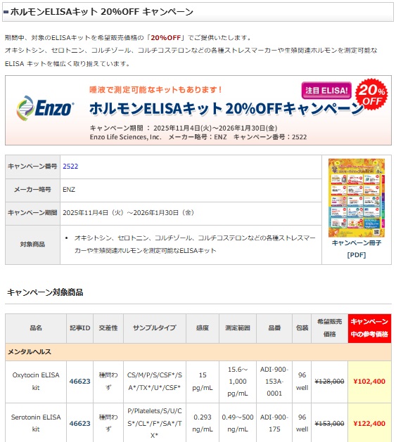 ホルモンELISAキット 20%OFF キャンペーン