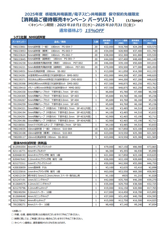 核磁気共鳴装置/電子スピン共鳴装置 保守契約のお客様限定 パーツ消耗部品 特別価格キャンペーン -