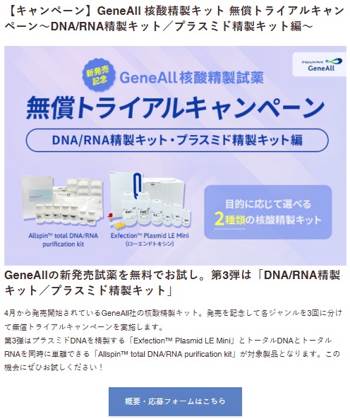 GeneAll 核酸精製キット 無償トライアルキャンペーン~DNA/RNA精製キット/プラスミド精製キット編~ -