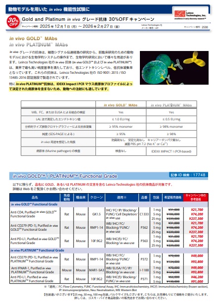 Leinco Technologies(レインコテクノロジーズ)社:Gold and Platinum in vivo グレード抗体 30%OFFキャンペーン -